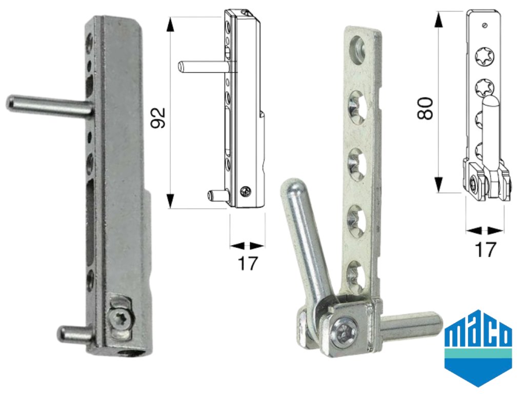 - na křídlovém pantu jsou 7 mm nosné čepy s délkou 23 mm Spodní pant s vyšší nosností křídlový Maco - technický list