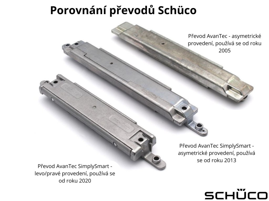 Převod je použitelný pro sklopná, otevíravá i otevíravě-sklopná okna se systémovým kováním Schüco AvanTec SimplySmart (od roku výroby 2013).