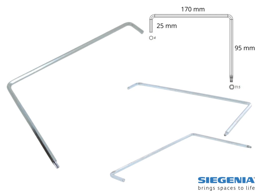 Klíč je určen pro běžné seřizovací prvky okenního a dveřního kování, kde se používá imbus 4 mm nebo Torx T15.